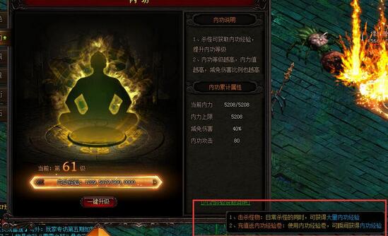 自玩家进入游戏后,雷霆之怒内功系统便开启,大家进入角色面板,在左侧的标签栏,能找到“内功”选项。大家进入内功系统里,可提升内功等级和了解内功的相 关玩法。内功等级提升需要消耗内功经验值,玩家可通过刷怪来获取内功经验值。 当内功经验值达到升级要求,大家进入内功系统,点击“一键升级”选项,可消耗 内功经验值对内功系统进行升级。